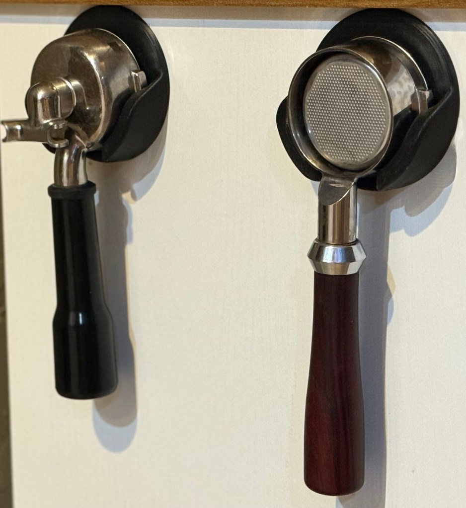 My real problem was my portafilters didn’t have a place to just “stay out of the way”. Moving them around during prep or during the time that I was puttering in the kitchen just wasn’t convenient. I don’t like leaving the portafilter in the grouphead when I’m not using it (or at least pre-heating it), but I’m embarrassed how long it took me to discover the portafilter. A solution I find to be elegant in its simplicity.